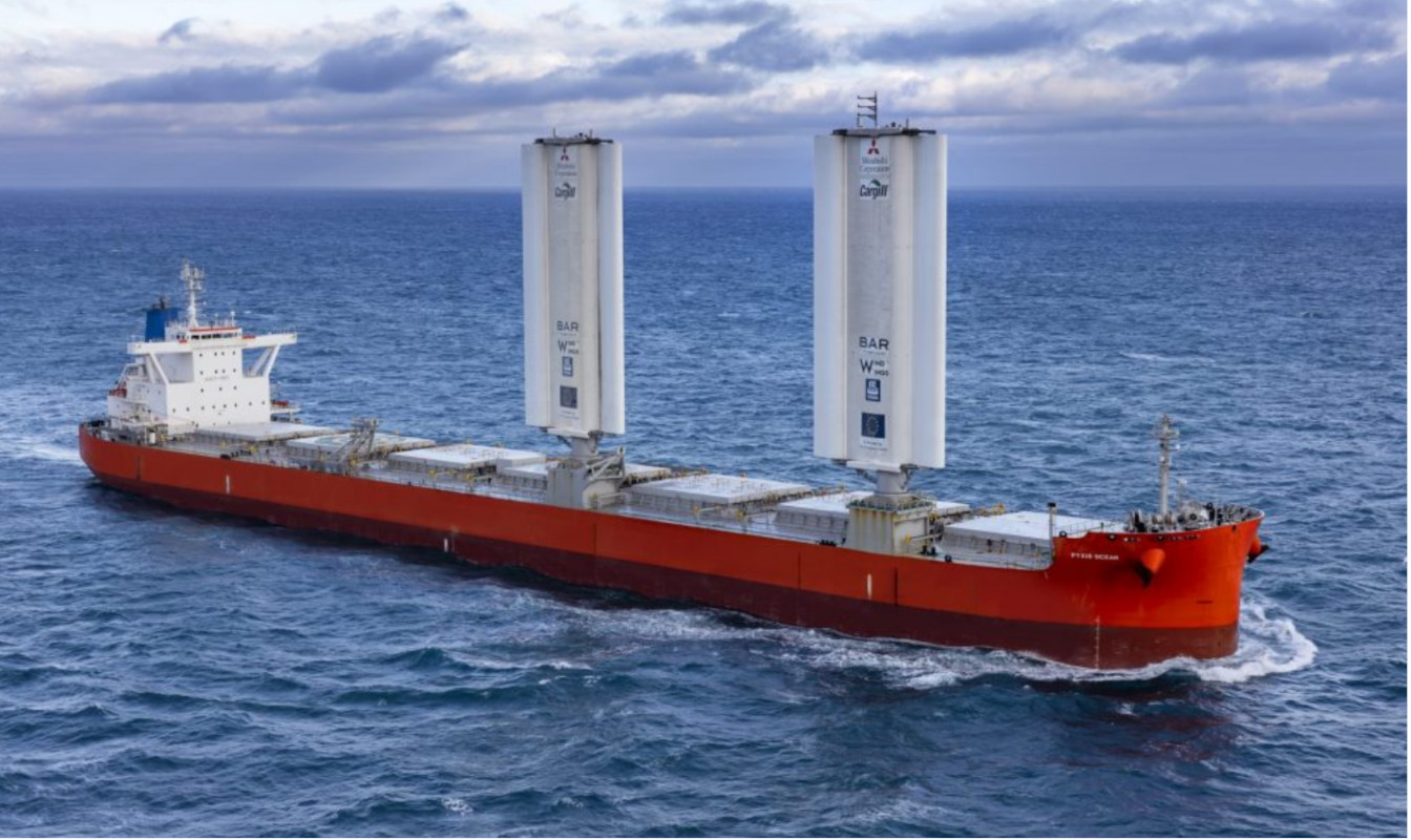 De Pyxis Ocean- het eerste droge bulkschip uitgerust met WindWings® van BAR Technologies – loopt voorop in windondersteunde voortstuwing en voltooide zijn eerste reis in 2023. WindWings zijn grote, stijve zeilen die gebruik maken van windkracht om het brandstofverbruik en de uitstoot te verminderen.