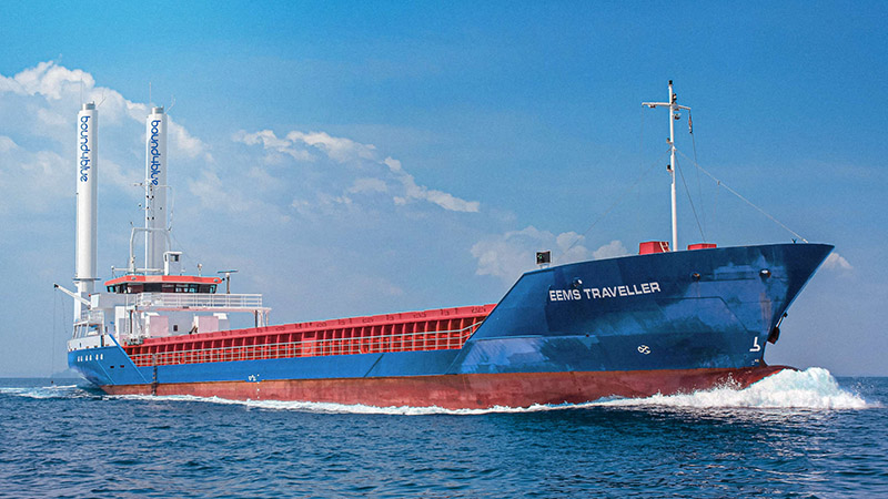 Afbeelding: de Nederlandse Eems Traveler met twee e-Sails van Bound4blue