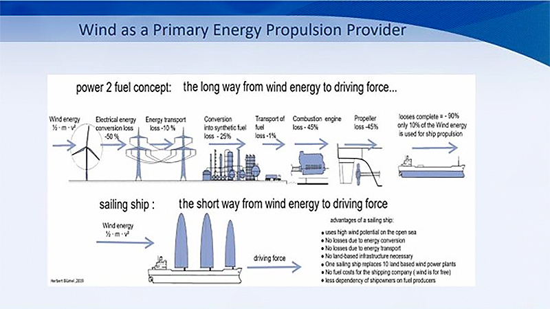 Wanneer we het hebben over windaandrijving, verwijzen we naar directe windenergie die wordt gebruikt voor voortstuwing, een pure energiebron zonder uitstoot, wereldwijd overvloedig aanwezig en vandaag de dag beschikbaar. Het kan rechtstreeks op het schip worden afgeleverd op het gebruikspunt zonder dat het hoeft te worden ontgonnen, verfijnd, vervoerd, gebunkerd of aan boord moet worden opgeslagen. In wezen is het een heel andere energiebron zonder kosten naast andere voordelen.