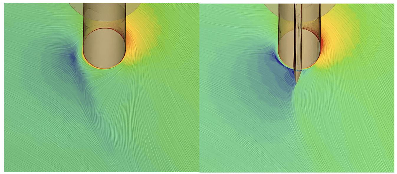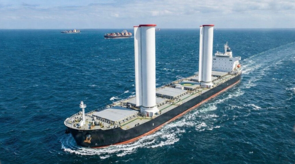 The EcoNavis design, however, essentially broadens the rotor’s effective “wind window” by reshaping the wind flow in the rotor’s wake to deliver higher thrust with lower torque demand. The Eco Rotor Sail retains the conventional rotating cylinder, but introduces a fixed aerodynamic appendage downstream to stabilise the airflow behind the rotor, reducing losses and allowing the system to continue generating thrust as wind conditions change.