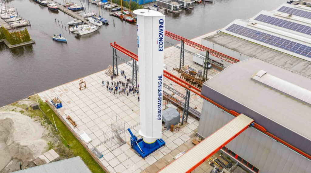 In the presence of dozens of invited guests, Boomsma Shipping sustainability manager Tessa Remery had the honour of cutting the ribbon, after which the impressive steel construction was hydraulically set upright on the quay of Nauta Staalbouw in Heeg, Friesland. The first 5-series unit will be installed on a Boomsma Shipping ship this summer, marking the new model’s commercial debut. Nauta latest built the VentoFoil for Econowind, which itself does not build in steel but in aluminium at its Zeewolde factory. The lowerable steel sail is, at 58 tonnes, by far the heaviest VentoFoil to date.