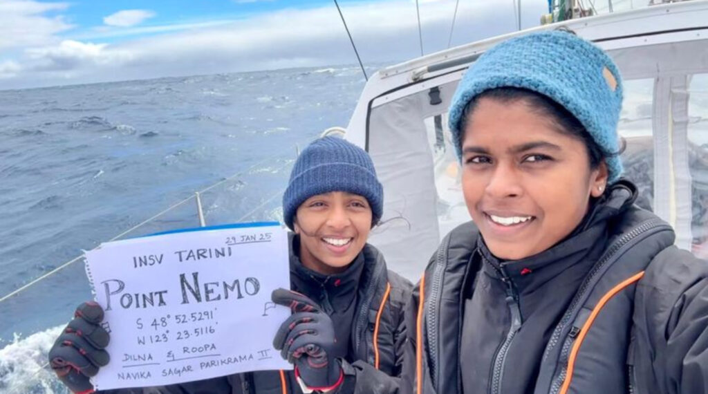 Lieutenants-Commanders Dilna K and Roopa A, aboard INSV Tarini, are en route from Lyttelton, New Zealand, to Port Stanley, Falkland Islands. Passing Point Nemo marks an important milestone in the Navika Sagar Parikrama II mission, an Indian Navy expedition aiming at a double-handed circumnavigation via the three Great Capes, undertaken by the two officers as part of India’s naval reconnaissance initiative.