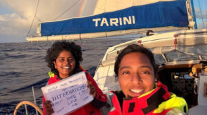 Lieutenants-Commanders Dilna K and Roopa A, aboard INSV Tarini, are en route from Lyttelton, New Zealand, to Port Stanley, Falkland Islands. Passing Point Nemo marks an important milestone in the Navika Sagar Parikrama II mission, an Indian Navy expedition aiming at a double-handed circumnavigation via the three Great Capes, undertaken by the two officers as part of India’s naval reconnaissance initiative.