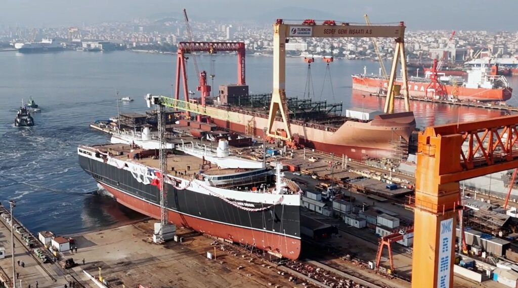 Cutting a line, the champagne was released by the French ambassador to Turkey, Isabelle Dumont. In her speech, she called the Neoliner Origin “more than just a cargo ship: it is a symbol of hope, sustainability, decarbonisation, and respect for biodiversity.”