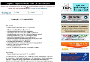 Er is een stichting zonder winstoogmerk opgericht: Stichting Zeepost. Deze gaat de organisatorische en zakelijke kant van de nieuwsbrieven en websites op zich nemen. We houden de kosten laag. Alle inkomsten worden in de verbetering van de nieuwsvoorziening gestoken. Een kleine onafhankelijke redactie gaat het nieuws selecteren en doorgeven op de websites en in de nieuwsbrieven. Adverteerders en sponsoren worden weer van harte uitgenodigd zich te melden. Dat geldt uiteraard ook voor abonnees van de nieuwsbrieven! Klik hier om u aan te melden als u nog niet op de verzendlijst staat.