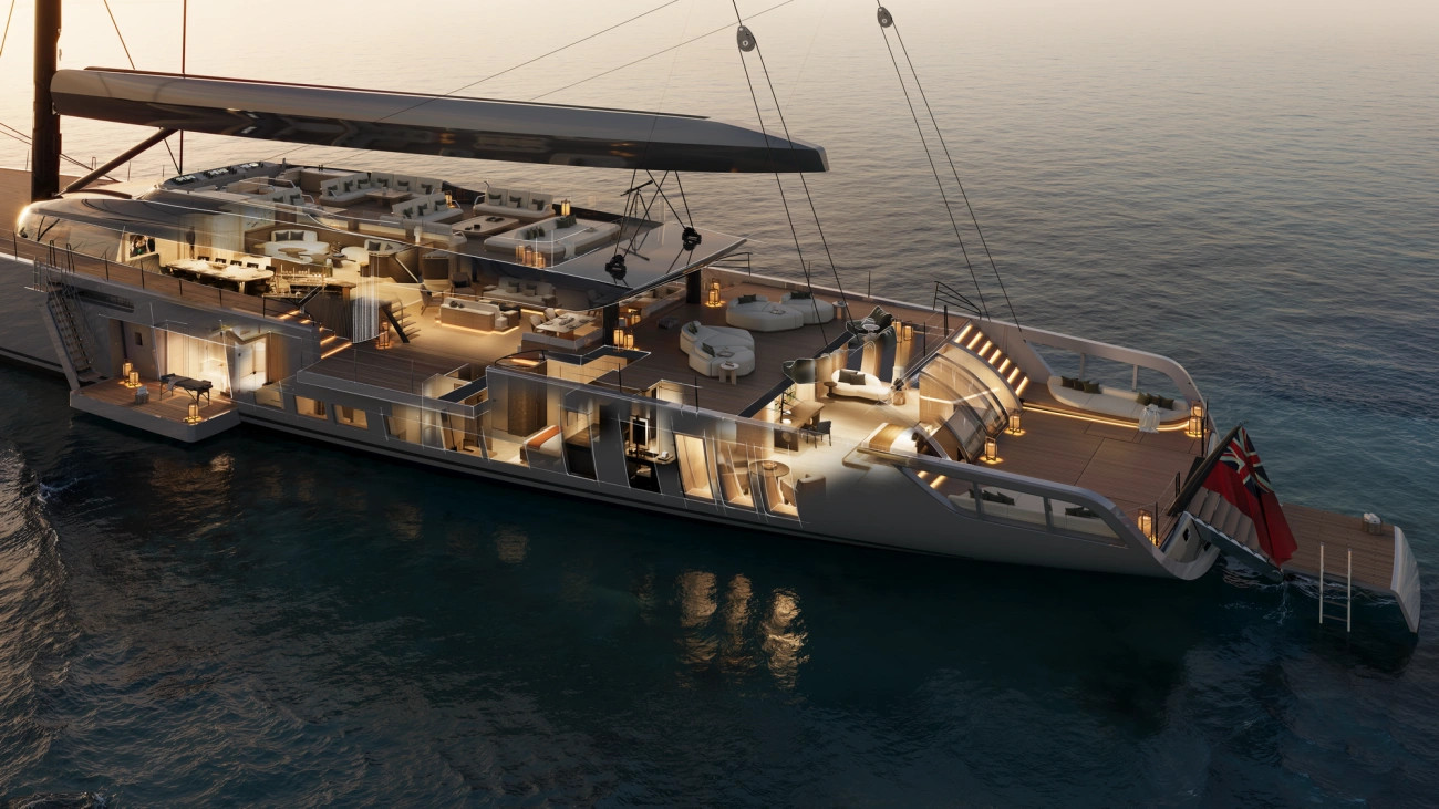 “SKY, een zeldzame kans voor een visionaire eigenaar: een 81 meter lange sloep bekroond door ’s werelds hoogste mast. Malcolm McKeon Yacht Design ontwikkelde de ambitieuze scheepsarchitectuur en de eigentijdse, toonaangevende exterieurstyling. Winch Design creëerde het elegante en inspirerende interieur van dit supergrote zeiljacht.