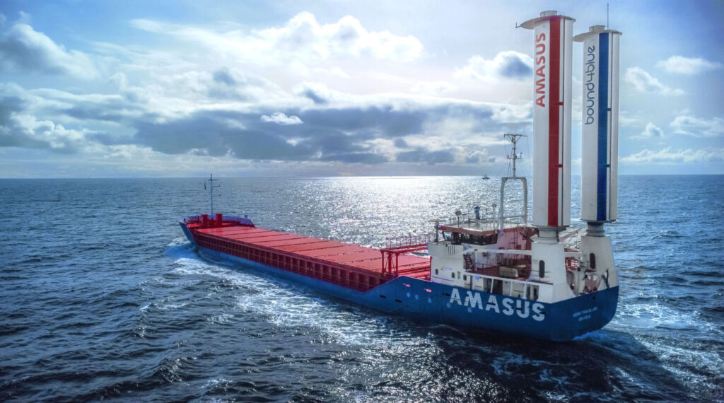 Het onder Nederlandse vlag varende vrachtschip, dat eigendom is van Amasus, zal zijn twee 17 meter hoge eSAILs® (zuigzeilen) van Bound4Blue tentoonstellen en laten zien hoe wind een industrie in transitie kan helpen om kosten en emissies te besparen en te voldoen aan steeds strengere regelgeving. De kant-en-klare oplossing werd in twee eenvoudige fasen geïnstalleerd, waarbij de zeilfundaties werden aangebracht tijdens een geplande stop van het schip in Nederland voor een vijfjaarlijkse klassevernieuwingsinspectie, voordat de zeilen zelf – in slechts vier uur – werden geïnstalleerd in de haven van Bilbao.