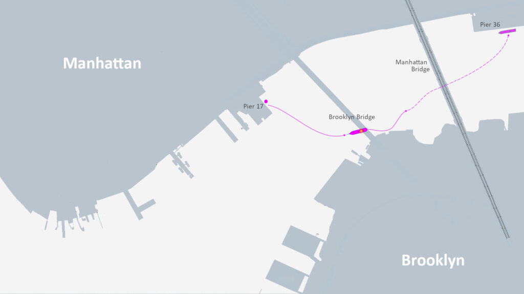 Er kan een stevige stroom staan op de East River. Het tijdstip van het ongeluk viel twee uur na laagwater, waardoor er al een flinke vloedstroom naar binnen stond. Daarnaast heeft de motor van het schip waarschijnlijk in de achteruit gestaan, want de snelheid van het schip, zo laten de verschillende filmpjes op sociale media zien, is bij het raken van de brug tegen de 7 knopen. Er stond een matige wind in dezelfde richting als de stroom, van ongeveer tien knopen. Op sommig filmmateriaal is schroefwater te zien, wat doet vermoeden dat de motor – althans op dat tijdstip – niet was uitgevallen.