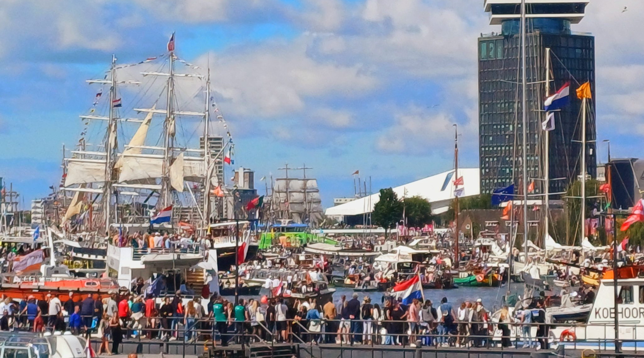 Voor de uittocht vormden allerhande bootjes zich rondom de Shabab Oman II en de NRP Sagres, die midden op het water klaarlagen om te vertrekken. Boten van Rijkswaterstaat, Port of Amsterdam en de politie begeleidden de Tall Ships over het water.